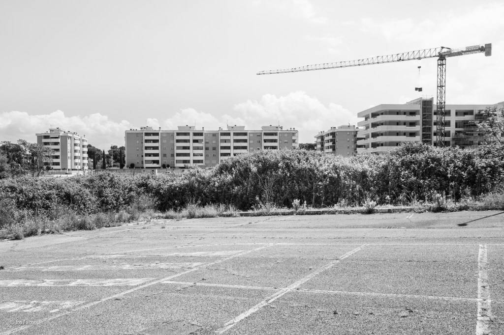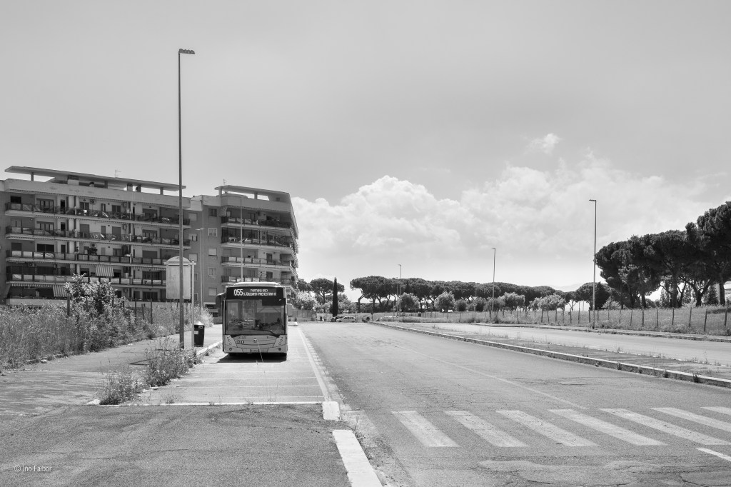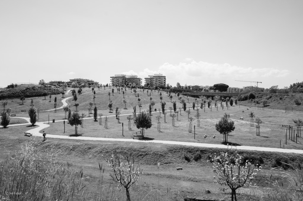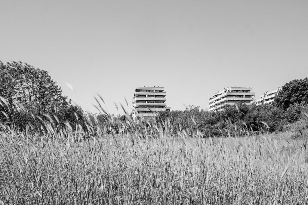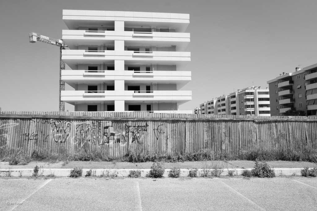 Le periferia di Ponte di Nona di Francesco Monaco colpisce per la sua rappresentazione di un realtà quasi lunare, con il bianco asettico ed abbagliante degli edifici, nuovi, che contrasta con le aree verdi e disordinate e la totale assenza di “vita” , se non attraverso le evidenti tracce che “l’umano” lascia al suo passaggio.